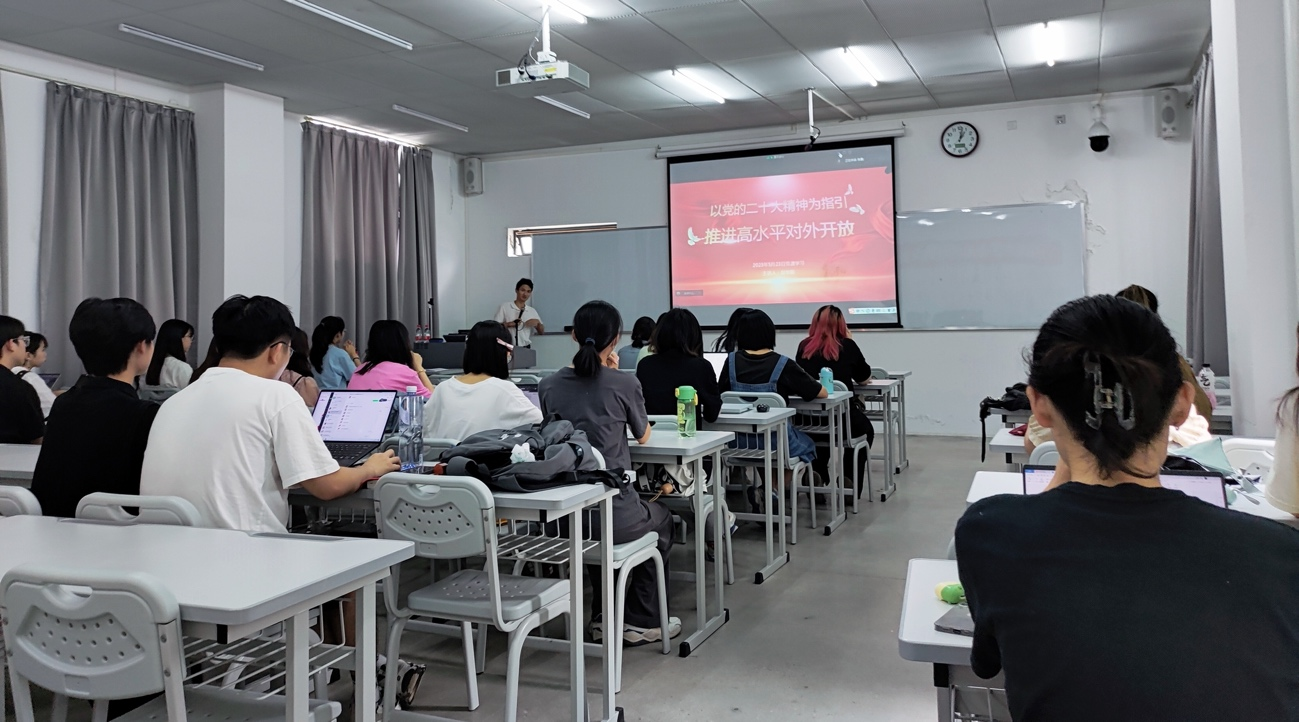 党委委员彭华新老师以《以二十大精神为指引 推进高水平对外开放》为题,为新闻系学生党支部讲授党课,支部书记余宗蔚老师及43名党员、发展对象参与学习。