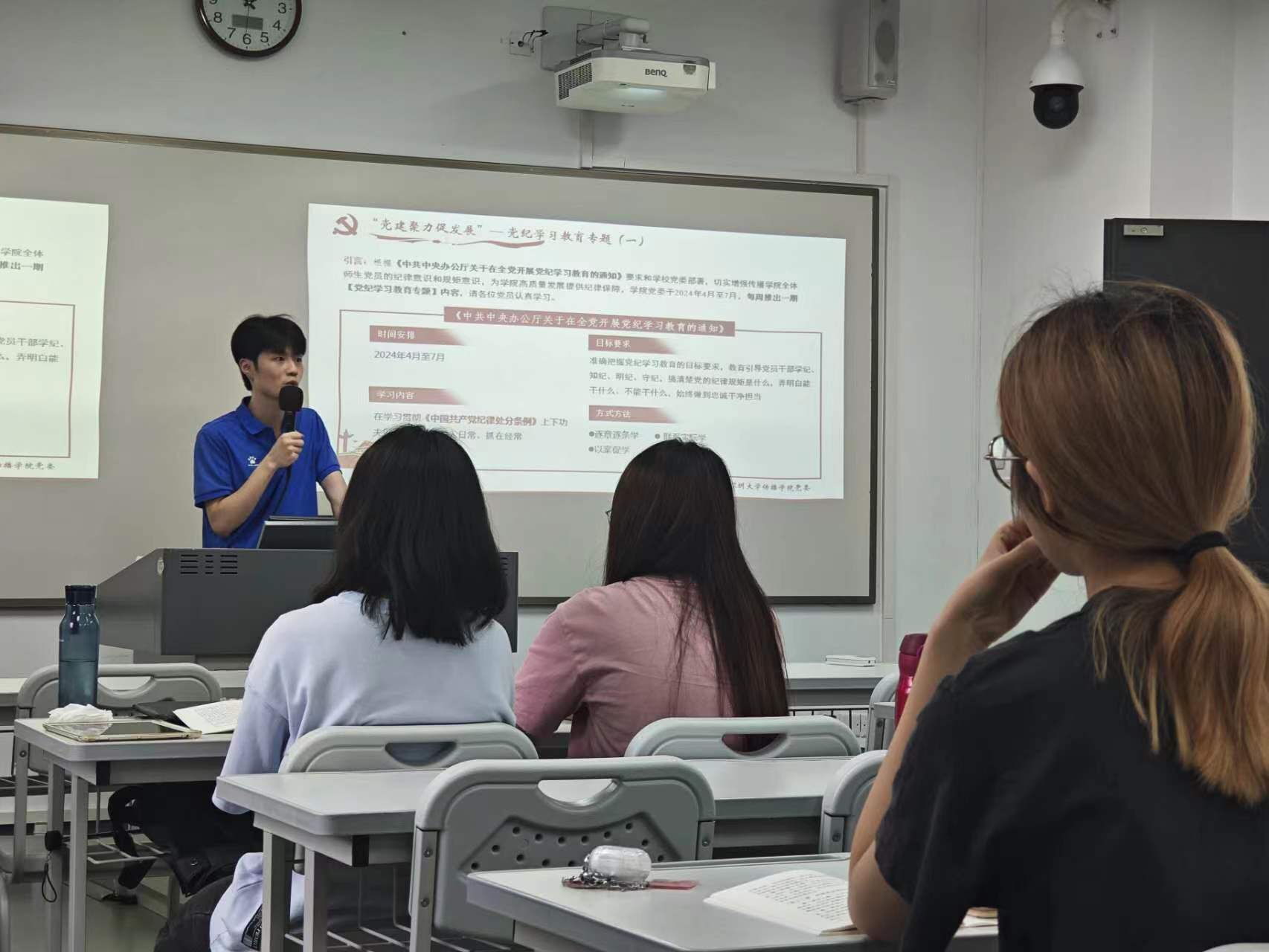 此次党纪学习教育主题活动,不仅是对政治理论知识的深化,也是对思想精神的净化和提升,有助于支部党员更好地理解和把握新时代党的纪律要求。通过原原本本、逐章逐条学《条例》,引导各位学生党员,坚定理想信念,树立敬畏之心,始终保持头脑清醒,保持政治定力,把把纪律学习作为必修课常修课,将党的创新理论作为大学学习的基本任务,把个人理想自觉统一到为中国式现代化挺膺担当。