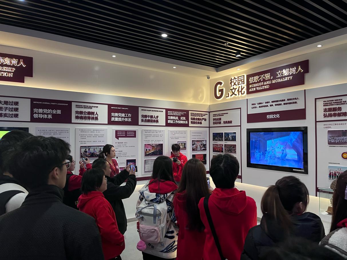 校史馆以纵横交错的时间为轴,以办学精神为主线,设有序厅、影视厅及十二个主题展区。开篇“发展沿革”呈现了1983年建校以来的重要发展事件,进而以“筚路蓝缕,创校启航(1983—1992)”、“脚踏实地,立校固本(1992—2007)”、“全面提升,创建一流(2007年至今)”三个阶段呈现学校创校、立校、强校的发展沿革,再通过人才培养、科学研究、学科建设、师资队伍、党的建设、校园文化、交流合作、办学条件、校友风采、发展展望等主题展区全方位展示学校的办学成果。同学们通过丰富的档案史料、实物及多媒体设备展示,深入地体会了“特区大学、窗口大学、实验大学”所蕴含的蓬勃创造力与生命力。
