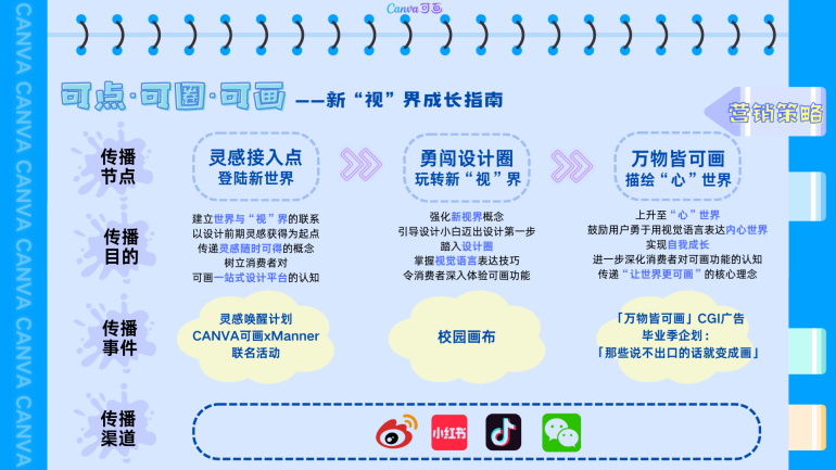 策划案捕捉当前颜值经济的趋势,将之转化为对视觉表达的深度追求,结合消费者在技能上的不足与产品的易用性优势,提出了“新视界成长指南”这一主题概念,通过“可点”、“可圈”、“可画”三个层次的艺术创作阶段,希望传达“让世界更可画”的核心理念。