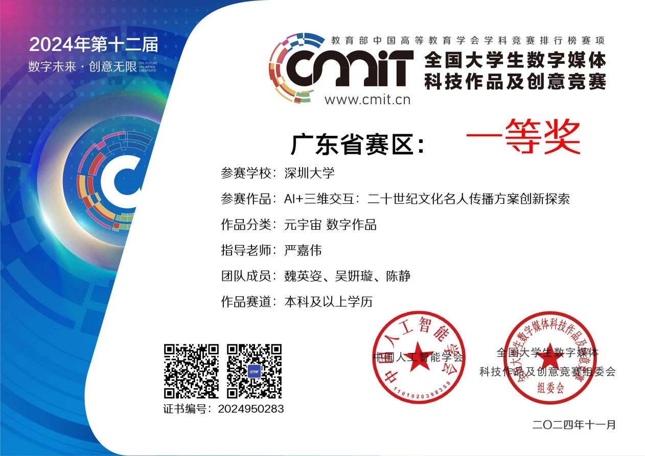 参赛项目“AI+三维交互:二十世纪文化名人传播方案创新探索”斩获“全国总决赛一等奖”奖项!。