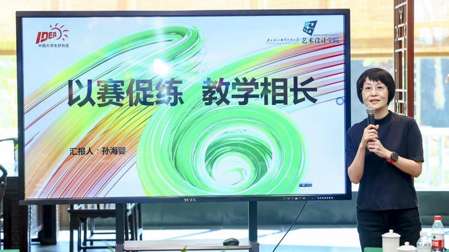 交流会中,优秀指导教师代表孙海婴老师与优秀组织工作者代表乔磊老师,分享了指导学生参赛获奖的经验与教学体会,为参会教师提供了宝贵的借鉴与启示。孙海婴教授作为广东轻工职业技术大学的资深教师,凭借其丰富的教学和指导经验,分享了从2018-2024年间大广赛国奖的获奖历程,详细阐述了参赛前的准备工作、如何把握大广赛的新趋向与教学的相互促进。乔磊博士则结合其在广州华商学院的执教经历,讲述了因热爱而投身教育的心路历程。她分享了如何在命题公布前提前准备UI赛道,以及通过荣誉感与仪式感激发学生群体效应的经验。同时,她还强调了学校对赛事大力支持对于提升学生参赛积极性与获奖成果的重要性。两位老师的精彩分享赢得了现场阵阵掌声,为参会教师提供了宝贵的经验与启示。
