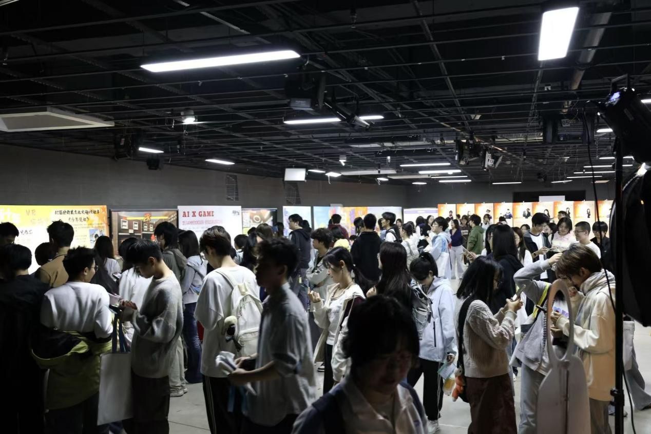社会模拟平台 Society Zero Universe 的运作逻辑,展现了师生在技术赋能社会治理议题方面的理论与实操能力。此外,网新系师生在VR助力非遗文化与红色文化传播等领域的创新作品获得广泛关注,“VR寻宝”等沉浸式互动体验吸引大量观展者驻足体验。现场同步展出的学生自制AI拳击游戏,仅用三天实现开发与落地,获得一致好评;AI人机协作Beatbox快闪则呈现了技术与艺术融合的创新表达方式,营造热烈互动氛围。