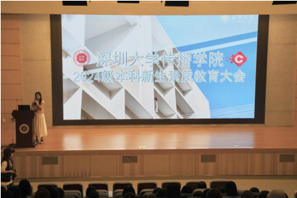 2024级本科新生素质教育大会在汇星楼2号报告厅顺利举行。学院副院长彭华新,广告系系主任张燕、新闻系系主任陈显玲、网络与新媒体系副系主任王伟以及265名本科新生(含本科留学生)参加,学院教务室邓慧娟主持会议。