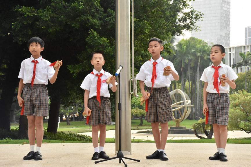 礼毕后,来自不同小学的几位“小红领巾”为老师和同学们表演了一段快板《升国旗》。明快的节奏和富有朝气的童声带领大家回顾了中国共产党的历史和革命先烈的英勇无畏,同时强调了五星红旗的重要性和象征意义,表达出对祖国的深厚情感,展现了中国人民的自豪感和对未来的希望。