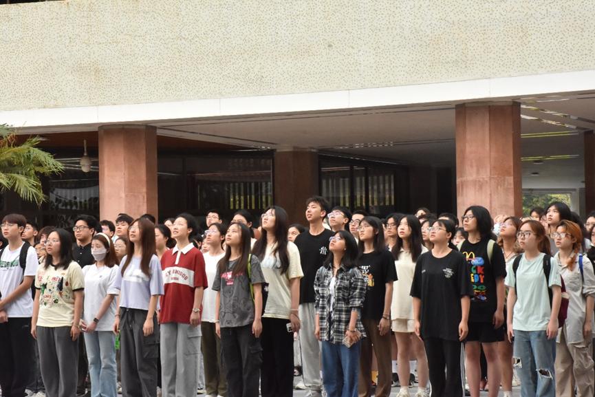 早上715分,升旗仪式正式开始。国旗护卫队队员们身着整齐的制服,昂首挺胸,步履坚定有力,护送国旗入场。在庄重激昂的《义勇军进行曲》旋律中,五星红旗徐徐升起,鲜艳的旗帜迎风飘扬。全体师生肃立致敬,高唱国歌。随后,国旗护卫队升校旗,校军乐团奏唱《歌唱祖国》,深大校旗在乐曲声中缓缓升起。