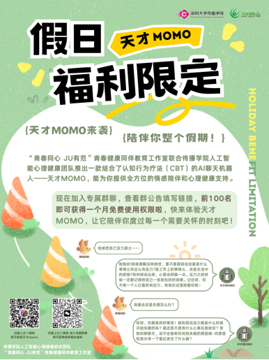 “青春同心 JU有范”青春健康同伴教育工作室推出了一款集心理学知识与人工智能技术于一体的AI聊天机器人——天才Momo,旨在为同学们提供全方位的情感陪伴和心理健康支持。